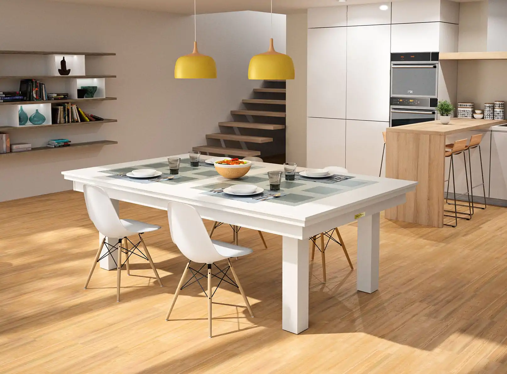 Customizable pool table thanks to its lacquered finish. A metal frame guarantees the rigidity and flatness of the playing surface. The mitered band frame is assembled by inserts on a rectified slate table. Genuine leather pockets to American BCA standards give this pool table a particular refinement. Leveling is done with precision thanks to adjustment jacks inserted under each foot. This pool table can be transformed into a dining room tablefor at least 10 people thanks to the table top option, and benches and chairs are available, in the colors of your pool table.