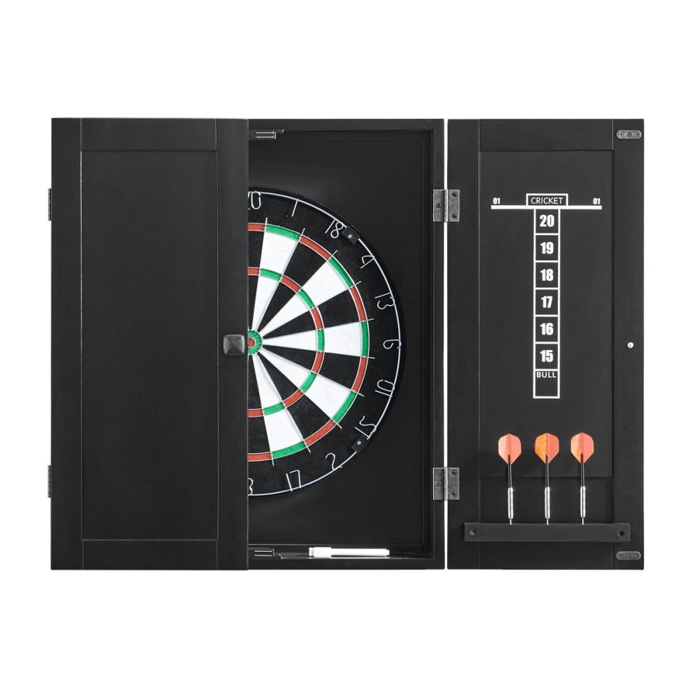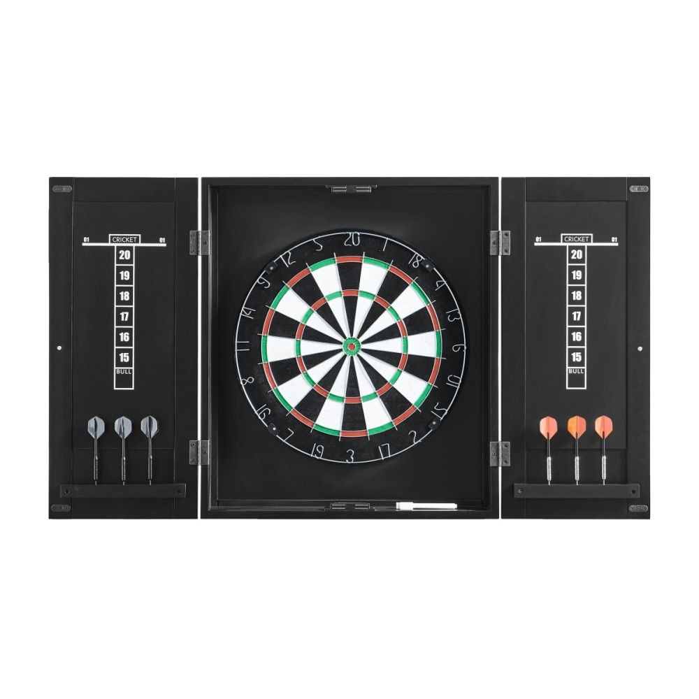 Features 18″ bristle dartboard