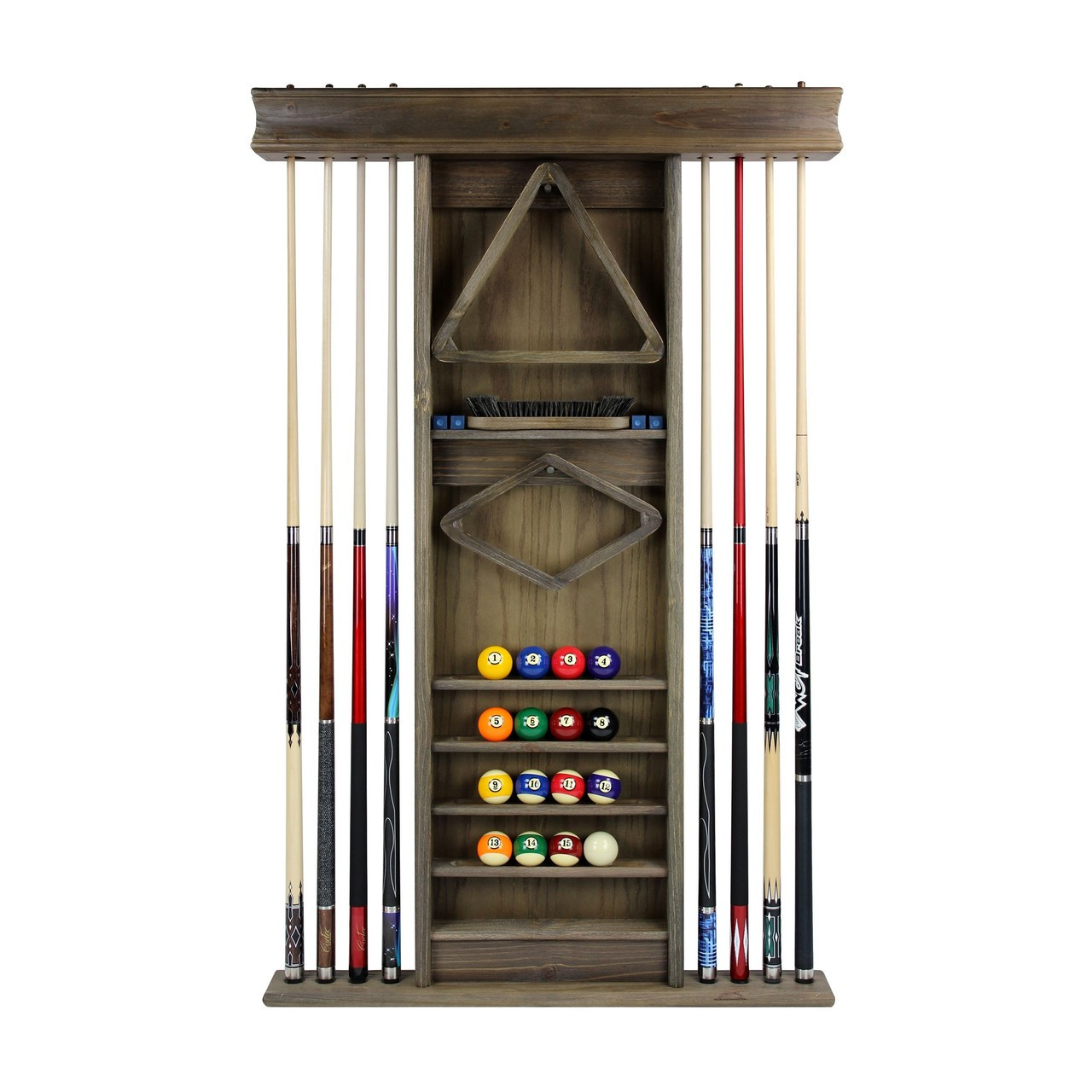 This Imperial Deluxe Wall Rack is a beautifully designed, solid wood wall rack in a Weathered Desert Chestnut finish. This rack isn’t just a cue rack. It holds 8 cues, a set of balls, triangle, and a 9-ball rack, chalk, and even your table brush. Measures 35.5-inches wide x 58-inches high x 4.5-inches deep. Hardware included. Assembly required.