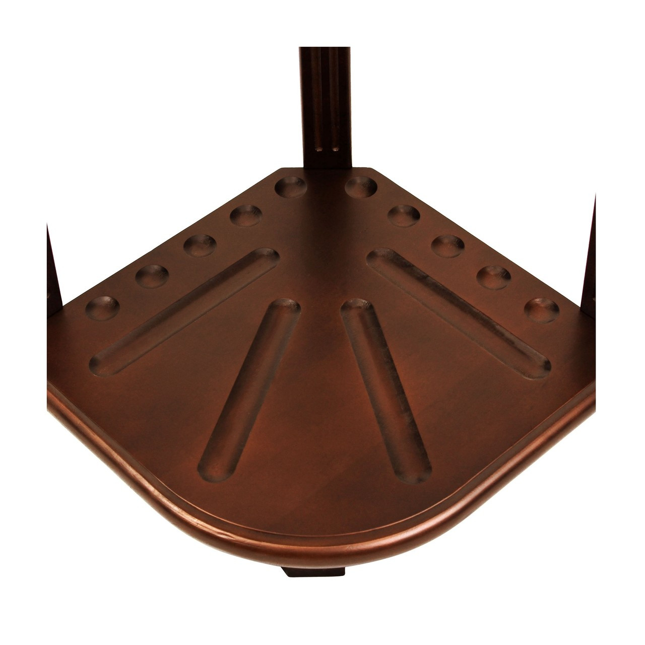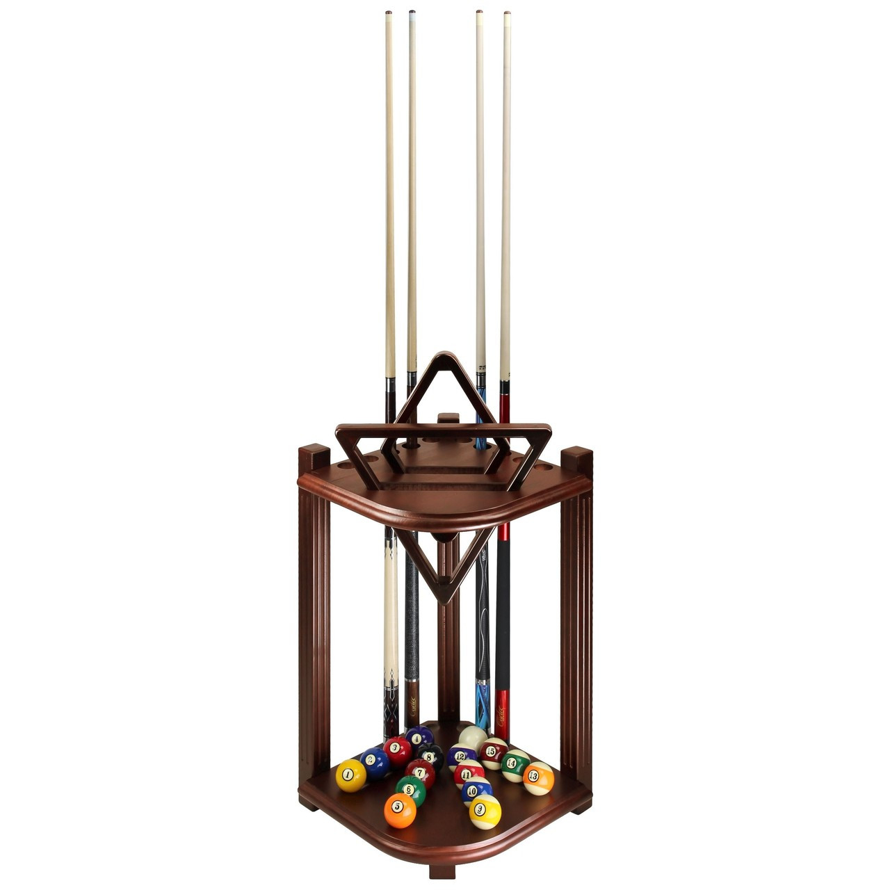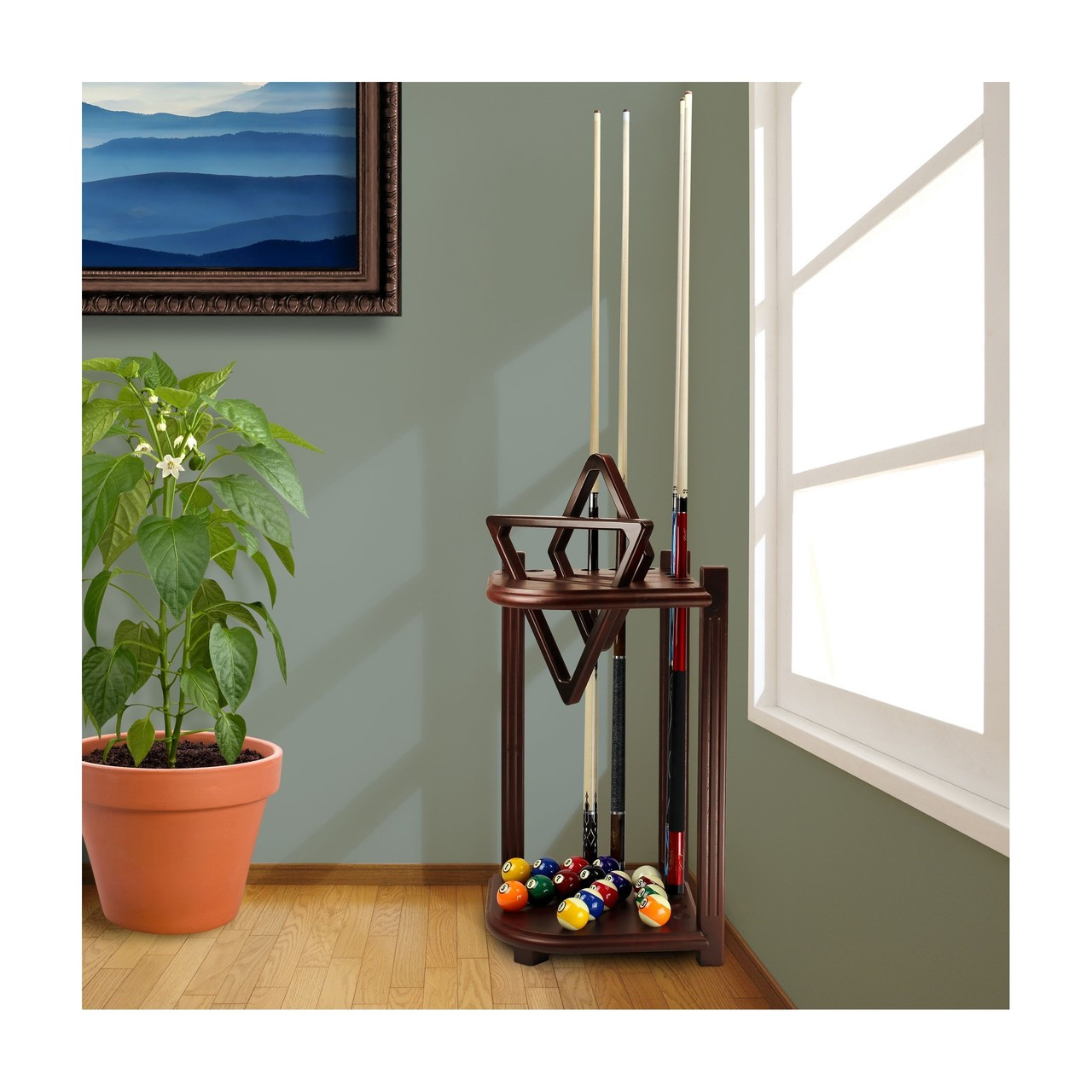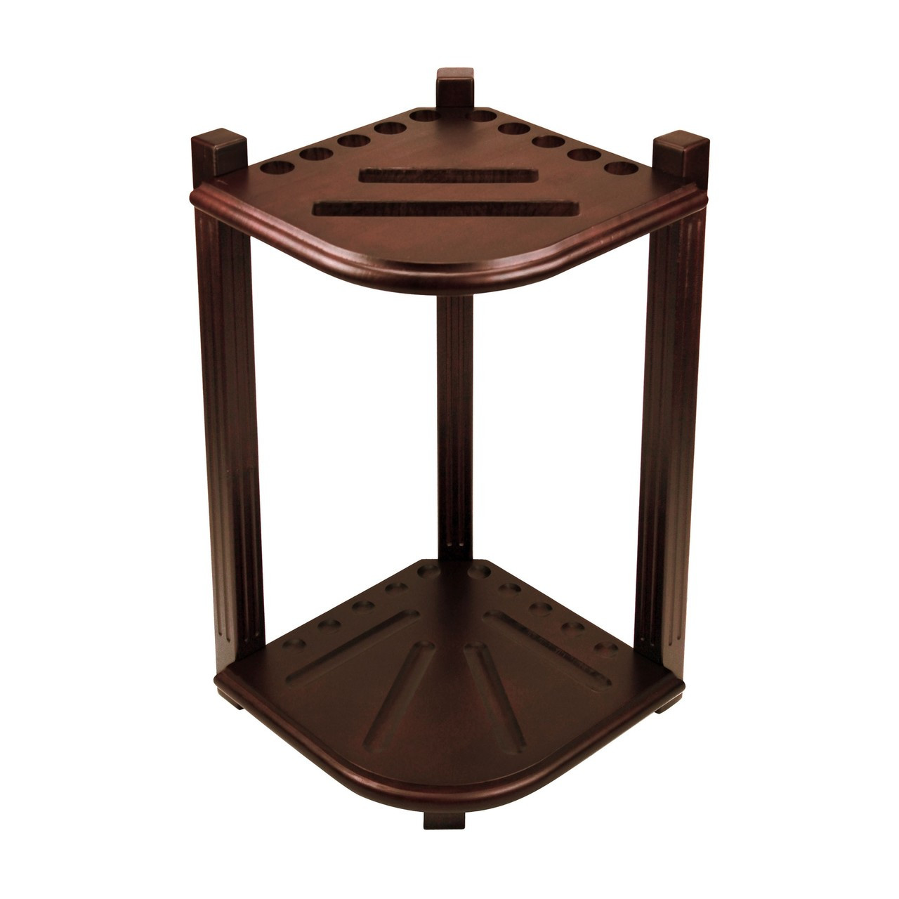 Solid wood corner cue rack with double thick design and an Antique Walnut finish. The top of the rack has slots to hold the triangle and 9 ball rack. Measures 15″ x 15″ x 28″ high. Holds a set of balls and 10 cues. Unassembled. Matches the Lincoln, Buchanan, and Penelope pool tables.