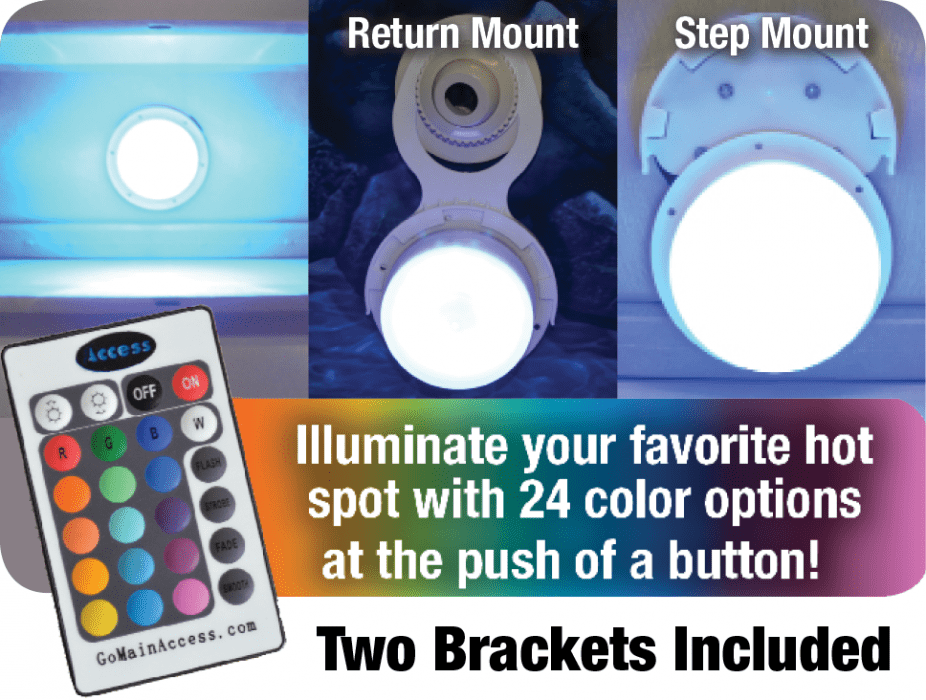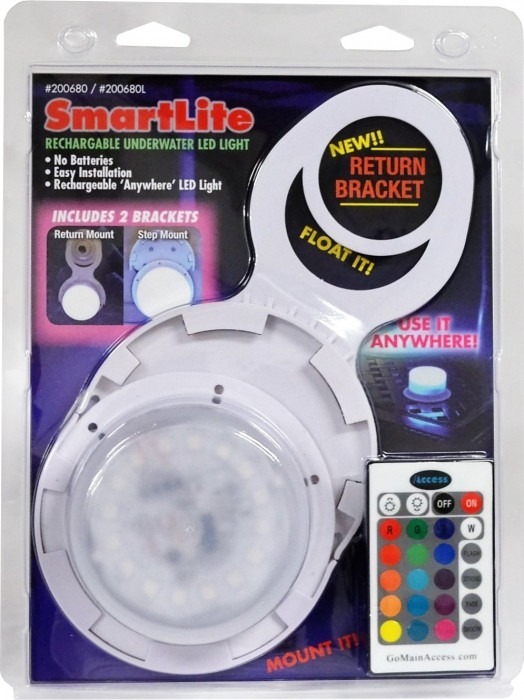 For use with all Main Access Steps and Entry systems, the SmartLight LED Underwater light can be installed during pool installation around your returnor as a later addition to your pool step and installs quickly without any hardware! Enhance your swimming experience with this Energy-saving LED light. Float it and light up your pool deck too.